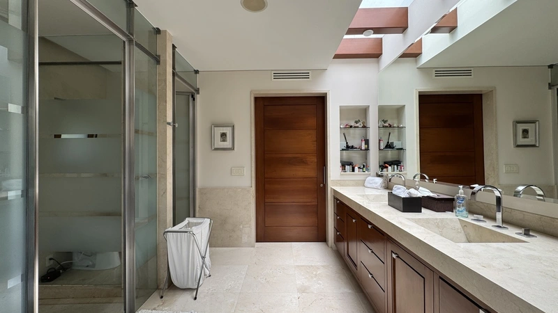 (ROJ) A solo minutos de Santa Fe, se encuentra esta propiedad única de 3,000 m² de terreno y 1,200 m² de construcción, diseñada para ofrecer privacidad, amplitud y una sofisticación arquitectónica inigualable. Ubicada dentro de un exclusivo conjunto de solo 10 casas, rodeado de áreas verdes, flora y fauna local, la residencia se integra de manera armoniosa con su entorno, ofreciendo amenidades y detalles de la más alta gama. Distribución y características principales: Recámaras: Todas con baño y vestidor; la principal con vestidor de aprox. 70 m², doble lavabo, dos regaderas y balcón con vista arbolada. Áreas sociales: Comedor conectado a dos terrazas, salón de juegos, bar con cava, chimenea interior y exterior. Cocina gourmet: Con isla central, desayunador, amplia alacena, pantry, cafetera Miele empotrada y un segundo desayunador con acceso al jardín. Family rooms: Dos áreas independientes para TV y convivencia, una con acceso a terraza y closet de blancos. Espacios de trabajo: Despacho privado con biblioteca y vista al espejo de agua. Exterior: Jardín de 700 m², terrazas de 100 m², espejos de agua, fuente interna. Comodidades adicionales: Elevador, 9 lugares de estacionamiento, amplia bodega, cuarto de servicio con baño, área de lavado. Acabados y tecnología: Mármol a la medida, detalles artesanales y espejos de agua con iluminación arquitectónica. Sistema de automatización Lutron para control de iluminación y persianas motorizadas Samy. Calefacción de pisos hidrónica. Canceles con doble vidrio para aislamiento acústico en áreas específicas. Áreas comunes del conjunto: Cancha de pádel, jardines y senderos rodeados de vegetación nativa. Esta propiedad equilibra arquitectura, naturaleza y confort, con el respaldo de un diseño atemporal. Disponibilidad y precios sujetos a cambio sin previo aviso.