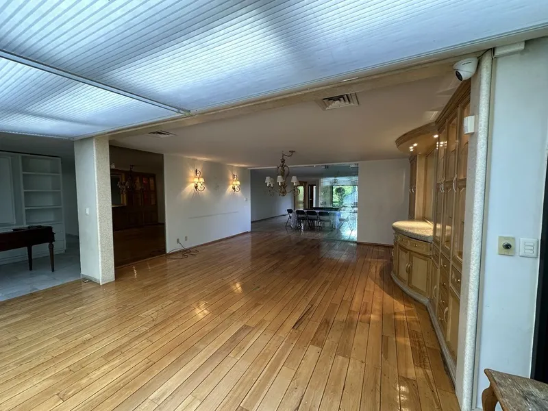 Hermosa casa ubicada en una de las principales calles de Bosques de las Lomas Distribuida en un solo nivel. 3 recámaras muy amplias con baño, separadas por una pequeña terraza interior techada con muro lloron. Espacios abiertos en toda la propiedad, acabados de gran gusto, piso de madera, muy ilumunada, cocina grande. Espacio para guardar 3 autos, cuarto de servicio con baño, area de lavado y patio de tendido.