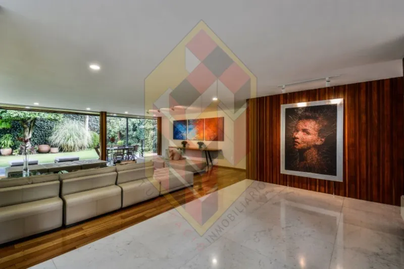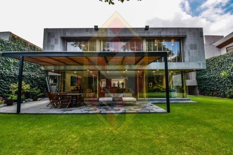 Disfruta de una lujosa casa de estilo moderno, distribuida en dos niveles con espacios muy amplios, en la planta baja se encuentra el área socia, sala con aceso directo a una hermosa terraza y jardin, comedor y cocina integral con antecomedor, en el segundo nivel hay 4 recamaras con vestidor y baño, family room y estudio. En el sotano hay una cava con vinos de la mejor calidad, los cuales puedes degustar con un buen tabaco. En la entrada hay un área de porteria para un vigilante. Tiene dos bodegas y 4 lugares de estacionamiento, dos son techados. Área de lavado y servicio