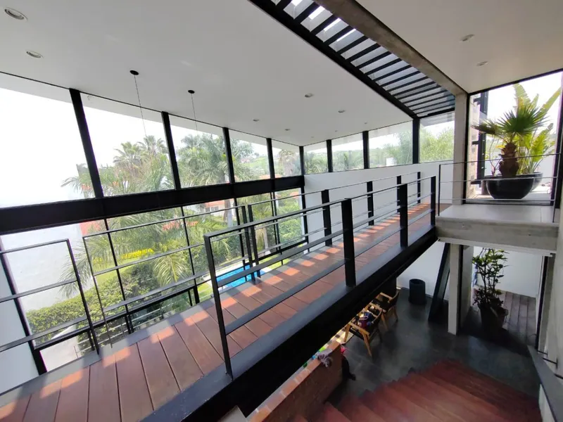 En el fraccionamiento Lomas de Cocoyoc, un desarrollo residencial reconocido por su seguridad e inigualable clima y tranquilidad para el descanso, a tan sólo una hora de la Ciudad de México. Se encuentra ubicada en la zona central del fraccionamiento dentro de la única área de reciente apertura cercana al Centro Comercial con todos los servicios ocultos y ubicada al fondo de una calle cerrada que lo hace gozar de una tranquilidad extraordinaria con prácticamente nula circulación de vehículos. Desarrollada en dos niveles y medio con un concepto arquitectónico basado en una superposición de planos con materiales y acabados neutros que dan origen a terrazas hacia el interior generando espacios únicos bajo una gran cubierta flotada y un gran ventanal que amalgama el exterior con el interior, con orientación ideal para mayor confort de temperatura y vista a los volcanes. Compuesta por sala comedor en desnivel y doble altura, cuarto de juegos con baño completo e integrado a terraza de alberca, 5 baños completos, toilette, 5 amplias recámaras con closet, terrazas y balcones, la principal con baño vestidor y terraza panorámica con jacuzzi, cocina integral con barra de granito, bodega interior, bodega exterior, cuarto de lavado exterior y casa de máquinas. Las terrazas en área de alberca, balcones y terrazas en recámaras están terminadas con deck de madera natural. Alberca con asoleadero y jacuzzi integrado con operación independiente e iluminación led con diferentes colores y escenarios, cuenta con caldera de alto rendimiento y doble sistema de filtrado. Cuenta con cisterna de 10 mil litros, tanques superiores de almacenamiento, sistema hidroneumático general, sistema de riego programable, toda la iluminación es led y de diseño, preparaciones para equipos de aire acondicionado, control de acceso y CCTV con sensores de apertura y movimiento monitoreado y controlado desde smartphone, sistema de televisión SKY e internet de alta velocidad. Se vende con persianas y totalmente amueblada, 4 recámaras cuentan con camas matrimoniales dobles (tipo canguro), la principal con cama king size, sala de estar en cuarto de juegos, refrigerador, mesa de herrería y madera cumarú con 6 sillas de herrería en color negro en comedor, además conjunto de camastros, sillas y mesas en color negro en área de alberca. Precio de venta con mobiliario: $ 10,150,000 El fraccionamiento cuenta con áreas verdes comunes, paisajes arbolados, cámaras de vigilancia, seguridad, club campestre, campo de golf largo de 18 hoyos y campo corto de 9 hoyos. Es factible la venta del predio vecino de 364m para ampliar el jardín ya que pertenece al mismo propietario.