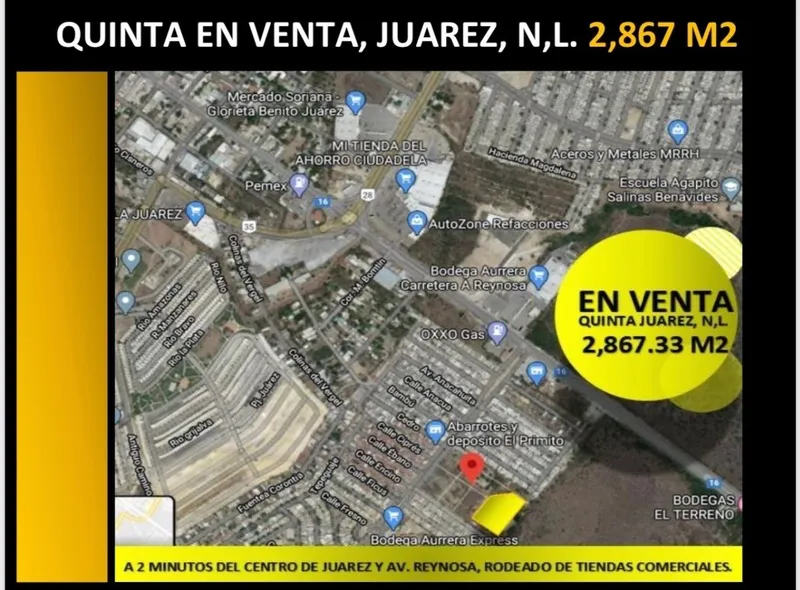 Quinta en Venta! Juarez NL‼ 2867.33 m2 $3.5 mdp Dentro del Fraccionamiento Árboledas del Parque. A 2 minutos del centro de Juárez y Avenida Reynosa. Rodeado de centros comerciales. Excelente ubicación. Ideal para centro recreativo para empresa o familia. ‼Excelente oportunidad de inversión‼