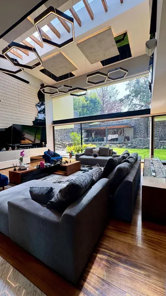 Espectacular residencia ubicada en una calle tranquila en la Colonia Jardines del Pedregal y a 5 minutos de ARTZ. Esta hermosa casa cuenta con las siguientes características: En la planta baja: Entrada peatonal con esclusa con caseta de vigilancia con circuito cerrado de T.V. en frente de calle y jardín trasero para vigilancia, misma que tiene medio baño para choferes. Fuente con bomba sumergible Dos portones eléctricos para estacionamiento cubierto para 4 autos y/o camionetas. Cuarto de máquinas. Cuarto de servicio con baño completo independiente. Cuarto de lavado y planchado, seguido de un patio de tendido. Bodega. Precioso jardín frontal de 50 m2. Al entrar a esta residencia, podrás encontrar: Un muy amplio recibidor. Sala de doble altura y comedor con una vista a su espectacular jardín interior. Medio baño de visitas. Family room con bar de gran tamaño con salida a terraza. Cocina de mazu con cubiertas de granito negro flameado, con isla totalmente equipada con parrilla, campana, lavaplatos, horno de gas, horno de microondas, cafetera, dos conjuntos de refrigerador y congelador toso de la marca SMEG, además de contar con un cuarto de despensa y salida independiente al área de servicio. Espacio para una cuarta recámara o estudio. Hermosa terraza con chimenea de etanol, asador y targa. Jardín posterior de 300 m2 con fuente sumergible. Sonido automatizado marca SONOS en tres zonas: Sala, comedor y terraza. Persianas eléctricas. Al pie de las escaleras podrás encontrar una bodega con luz inteligente. Luces de cortesía en escaleras. Vigas de madera. En la planta alta: Sala de TV / Family Room. Recámara principal con vista al jardín, baño con doble lavabo, vestidor de gran tamaño con isla al centro. 2 recámaras con vestidor y baño completo cada una, una de ellas con vista al jardín y la otra con terraza. Acabados: Persianas eléctricas. Pisos de ingeniería para sala, comedor, medio baño de visitas, habitaciones y vestidores. Cancelería de aluminio electropintada en color negro mate de primera calidad. Vidrios templados en sala, comedor, cocina y fijos en planta alta y baja. Puertas de vidrio templado en baños. Luminarias de toda la casa en tipo LED (bajo consumo). Pisos naturales de recinto en garage y terraza. Cisterna con capacidad de 14 mil litros, equipada con bombas sumergibles y silenciosas. Recirculador de agua caliente en toda la casa. Sistema de iluminación inteligente marca LUTRON. Carpintería de escalera en madera maciza de encino. Riego automatizado con tablero de control. Sistema de paneles fotoválticos. Gas estacionario. Qué esperas para estrenar tu casa con * !! Acércate a nosotros, aquí encontrarás la mejor Asesoría para cumplir el sueño de estrenar tu propiedad !! Llámanos ya !! * contacto@**
