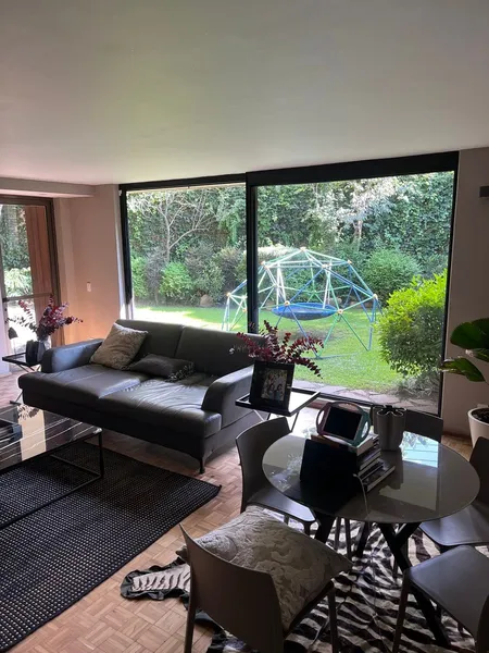 En el corazón de Las Lomas de Chapultepec, casa con excelente ubicación, en una bonita calle arbolada a dos cuadras de Avenida de Las Palmas. Arquitectura atemporal, remodelada hace seis años. Con madera y piedra en fachada y al interior pisos de madera de alta calidad; toda la casa con mucha iluminación y vista al jardín que la rodea en su totalidad lo que otorga privacidad. Bien distribuida en dos niveles. En el primero se encuentran sala y comedor de generosas dimensiones con amplios ventanales y acceso al jardín; un family room, y oficina que dan a una agradable terraza con pared en madera. Baño de visitas completo y, una espaciosa y moderna cocina con lugar para desayunar o cenar, con acceso a un patio exterior y vista verde. En el segundo nivel hay cuatro recámaras iluminadas, la recámara principal con vestidor, baño con tina y balcón; dos recámaras con clóset que comparten baño, la cuarta recámara con baño completo. En este mismo nivel se ubica la lavandería y un cuarto de servicio. En una esquina del hermoso jardín se encuentra un espacio para un comedor exterior para disfrutar de comidas. Lugar de estacionamiento para 5 autos y una bodega.