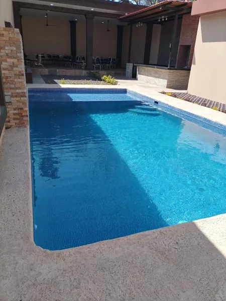 Edificio Nuevo: Techos altos, Espacios amplios, Sala Comedor Cocineta con Cubierta de Granito. • 2 recamaras con closets, 2 baños completos. • Ventanas Antirreflejantes De Aluminio. • 2 Minisplit Magnum Inverter, Abanicos de techo • Cochera automatizada y techada hasta para 4 vehículos • Palapa 70 M2 equipada tarja y asador incluido • Alberca 4 X 8 mts. • Baños exteriores, 2 de hombres y 2 de mujeres • Amplio Jardín • Cuarto de Máquinas • Bodega