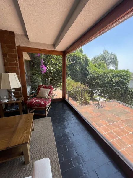 Hermosa casa en venta dentro del fraccionamiento lomas de santa fe. Propiedad de estilo colonial que consta de 550 m2 de terreno,desplantados en forma descendente, la propiedad da de calle a calle, su orientación es magnifica, cuenta con mucha luz natural y una vista espectacular hacia los volcanes. La casa principal cuenta con 483m2 de construcción 4 recamaras, la principal con su baño y vestidor. Recamara 1 cuenta con baño y vestidor. Recamaras 2 y 3 comparten baño y tienen closets. El área social es muy agradable ya que cuenta con una vista espectacular que se integra a una linda terraza y esta a un jardin. Una linda chimenea, un área de despacho. Medio baño y closet para visitas. Cocina de buen tamaño con despensa. Area de lavado y cuarto de servicio con baño Estacionamiento para 5 autos. A su vez la casa cuenta, con un departamento totalmente independiente de 230m2 de construcción son 2 recamaras con dos baños completos área social de buen tamaño y su cocina con área de lavado. Se encuentra rentado. se puede vender con o sin inquilino.
