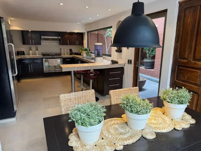 Hermosa casa en venta, con excelentes vistas al bosque y la Ciudad de fondo desde cualquier ángulo. Distribuida en 3 niveles de manera descendente. En la estrada principal, te encuentras en primera vista con una estancia amplia de sala - comedor con techos altos y un gran ventanal que la ilumina con luz natural. La sala cuenta con una chimenea y un espacio para almacenar leños que lo hace un espacio muy acogedor. La cocina integral cuenta con un espacio de almacenamiento para vajillas y para alacena. Cuenta con un antecomedor para al menos 6 comensales. y medio baño de visitas. 1er piso descendiente: encontrarás las 3 recámaras de la casa. La principal tiene completa privacidad y lujo con vista panorámica a árboles y la ciudad de fondo. Cuenta con área de sala, un vestidor amplio y baño con tina. La recámara 2 y 3 comparten un baño completo y un amplio vestidor. Afuera de las recámaras se encuentra un área de TV. 2do piso descendiente: "La zona favorita de la casa". Un área familiar, social, completamente de recreación. Espacio ideal para reuniones respetando los espacios privados de la casa al contar con un comedor adicional, cocineta con lavabo, sala, área de juegos, área para gym, un baño completo y acceso al jardin trasero. Además tiene un estudio independiente ideal para home office. Todas las puertas de la casa son talladas en madera con decoraciones mexicanas únicas y originales. Son 3 cajones de estacionamiento (uno junto al otro). Una bodega de aproximadamente 70 m2. Cuarto de lavado y servicio con baño completo independientes.