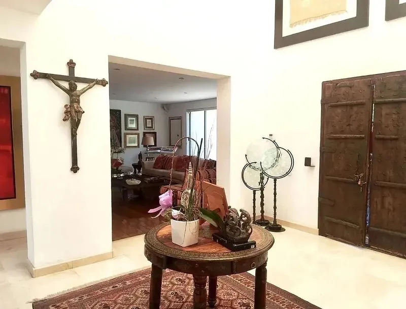 Espectacular casa llena de luz, excelentes espacios, remodelada al 100 en 2010, moderna, acabados de lujo, hermosas vistas verdes, con increíbles terrazas, en excelente estado de conservación en ubicación privilegiada con vista verde a zona de donación. En PB, lobby de entrada con doble altura, sala y comedor independientes, sala de gran tamaño con chimenea, comedor con salida a terraza integrándose totalmente a la misma. Hermosa cava , baño de visitas, área de juegos social, cubo con terraza, espejo de agua y muro llorón con salida a la cocina y se integra a área social. Gran cocina equipada con electrodomésticos muy iluminada, con pantry y despensa de buen tamaño, excelente área de lavado con lavadora y secadora con entrada desde la cocina. En primer piso dos recámaras secundarias cada una con baño y comparten gran vestidor, una de estas recámaras con espacio independiente que puede ser usado como estudio y tiene salida a la segunda terraza., tercera recámara secundaria con baño y vestidor. Gran espacio de family con espacio para diferentes usos con salida a terraza. En el último piso gran recámara principal con increíble vestidor, gran baño, doble lavamanos independientes y espacio para pequeño gimnasio. En el sótano , área de estacionamiento, 4 lugares de estacionamiento techados, caseta de vigilancia con baño completo independiente que puede ser usado por vigilantes o por choferes. Dos cuartos de servicio con baño completo cada uno, dos bodegas y patio de servicio, desde esta zona hay una escalera de servicio que comunica a la casa con todos sus niveles.