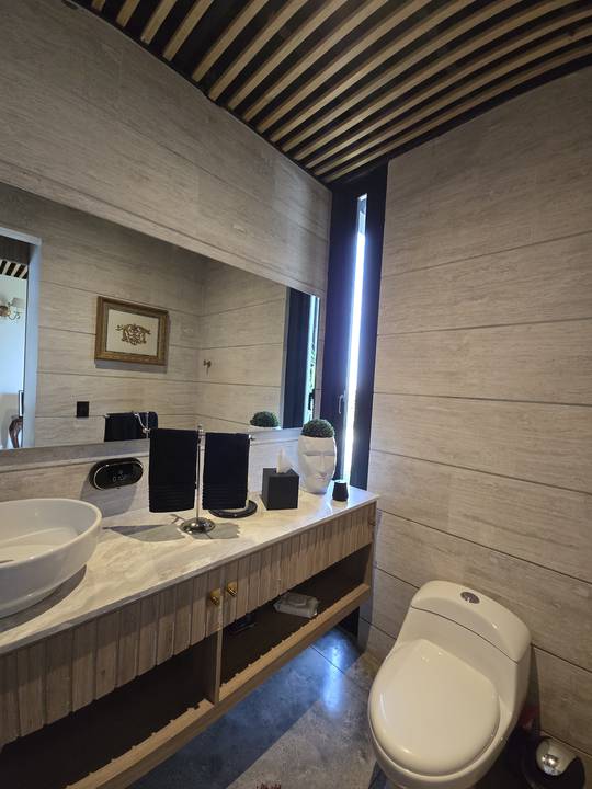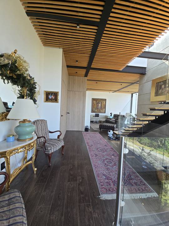 Casa con los mejores acabados y espacios, en exclusivo fraccionamiento "La Paloma" en Bosque Real. La calidad de vida en un solo lugar, con una creciente plusvalía y muchas areas verdes te esperan en esta hermosa casa con luz por todos lados. Casa con IA a traves de un sistema de cableado especial diseñado para controlar las camaras, lamparas, puertas y ambientar con musica los espacios de tu nuevo hogar. Acabados de marmol en baños, barra de cocina con cuarzo, madera Teca, Roble en las escaleras, barandales de cristal templado de 9mm y 6mm en paredes, piso de concreto pulido al alto brillo, piso laminado en recamaras, lambrinados, y el soporte de la propiedad con 19 columnas de acero. Planta baja: Estudio u oficina con cristal templado. Medio baño de visitas. Cocina con barra de cuarzo y alimentacion elcetrica. Area de lavado. Despensa. Sala/Comedor con buena altura y acabados con madera en techo. Ventanales de piso a techo con cristal de 6mm Salida al jardín interior con terraza. 1er nivel: Recamara principal con balcón y vestidor de buen tamaño. Baño con tina y regadera. Family Room 2 recamaras secundarias con baño y vestidor cada una. Ventanales de 6mm de piso a techo. Escaleras de madera de roble. 2do nivel: Area de roof garden. Tomas de gas y agua. Oportunidad de realizar un pergolizado a su gusto. Sotano: Garage para 6 autos. Bodega de buen tamaño. Cuarto de servicio con baño completo. Ven y conoce esta propiedad, Bosque Real cuenta con los mejores colegios, casa club con campo de golf, seguridad con estricto control, camaras C5 y acceso a la autopista que te lleva a Interlomas, Herradura y Santa Fe en minutos.