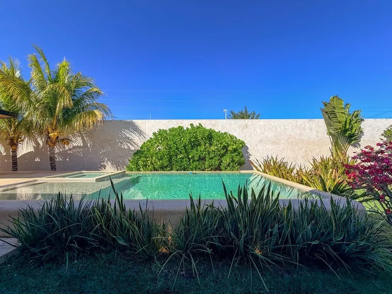 🏡 Espectacular residencia de un solo nivel con 1,346m2 de superficie de terreno, distribuida en un solo nivel con acabados espectaculares, así como una iluminación natural en toda la casa y ventilación cruzada. Esta residencia se caracteriza por sus amplios espacios y su conectividad con la naturaleza, lo que permite tener una casa muy agradable que siempre se mantendrá fresca. Ubicada en Santa Gertrudis Copó, al norte de Mérida, esta propiedad se encuentra en una zona tranquila y bien conectada. Aquí puedes moverte con facilidad hacia plazas, hospitales y escuelas, disfrutando de un entorno residencial moderno, con calles amplias y todos los servicios a pocos minutos. Vivir en esta zona es tener cerca espacios como La Isla Mérida y City Center Mérida, además de acceso rápido al periférico. Santa Gertrudis Copó combina comodidad, buena ubicación y un ambiente agradable para el día a día. Garaje techado para 4 vehículos Pasillo con vegetación y acceso principal Amplio recibidor con jardín interior Comedor Cocina con isla totalmente vestida Recámara secundaria 1 con clóset vestidor y baño completo con tina Recámara secundaria 2 con clóset vestidor y baño completo con tina Recámara principal con amplio clóset vestidor, área de gimnasio y baño completo con tina Amplio jardín social con conectividad a la recámara principal Alberca con acabo chukum con sistema de filtrado e iluminación Terraza / área de bar con meseta Jacuzzi con hidromasaje Terraza climatizada con baño completo (family room) Gran terraza techada conectada con la alberca y jardín Cuarto de servicio con baño completo Cocina de servicio Cuarto de lavado con tendedero Bodega exterior Cuarto de máquinas CARACTERÍSTICAS: Toda la casa tiene ventanales que conectan con el área social, lo que permite mayor iluminación. Por su orientación el sol no pega de frente a los ventanales, lo que permite mayor frescura. Todas las áreas cuentan con jardines interiores (recámaras, baños, cocina, recibidor) Cuenta con videoportero y sistema inteligente para automatizar la casa. Preparación para paneles solares. EQUIPAMIENTO: Carpintería en cocina Carpintería en las habitaciones Aires acondicionados Ventiladores Persianas / cortinas Vegetación ¡Y más! Solicita más información con tu asesor. MEDIDAS: Terreno 1,346m2 | Frente 25.00m x Largo 53.90m Construcción 542m2 FORMAS DE PAGO: Apartado $50,000 válido por 7 días • Permitido fumar • Alberca Powered by