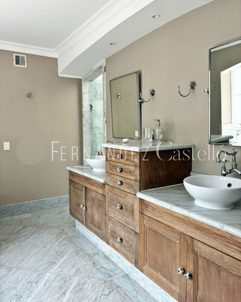 Esta casa esta ubicada en una calle donde los vecinos tienen una caseta de policía ubicada justo enfrente, a dos pasos de Palmas cuenta con una excelente ubicación. A la entrada donde había unas jardineras hay un espacio que puede ser bodega o un cuarto de vigilancia. La casa tiene un espacio para garaje donde caben 4 coches y en la planta baja se encuentra una sala, un comedor, un estudio, otro espacio que puede ser otro salón , un bar y medio baño de visitas. Salida a una terraza y el espacio de un jardín (que lo convirtieron en terraza) además de un baño completo en esa área. En el primer piso están 3 recámaras , todas con vestidor y baño , la principal con espacio más grandes, un family con salida a una amplia terraza y un pasillo donde se encuentra closets de blancos y las escaleras para subir a los cuartos de servicio que son dos. En el tercer nivel está lo que podría ser la cuarta recámara con baño completo y amplio closet. Excelentes acabados madera, cantera y mármol.