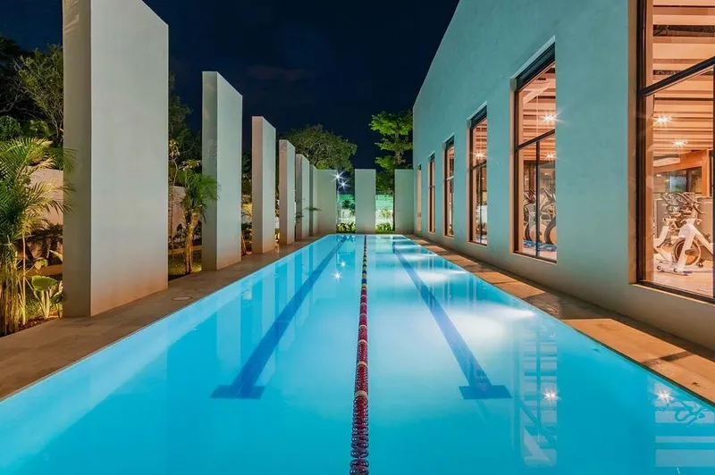 Residencia con amplios ventanales que aportan luz natural y conectan interior con exterior. Fachada en tonos claros con piedra natural, terraza techada, piscina y jardín. Superficie: Terreno: 432 m² Construcción: 370 m² Distribución Planta baja: Estacionamiento para 4 vehículos Sala Comedor Cocina Habitación secundaria con baño completo 2 medios baños Terraza con grill Piscina Planta alta: Habitación principal con walk-in closet 2 habitaciones secundarias con baño propio Detalles: Acabados de lujo Lambrín Chukum Madera Tzalam Piedra natural Acabado en masilla Acabado en pasta porcelanato Granito Mármol travertino Piscina con acabado pulido tipo cuarzo El precio total se determinará en función de los montos variables de conceptos de crédito y notariales que deben ser consultados con los promotores de conformidad con lo establecido en la NOM-247-SE-2021. *Precios sujetos a cambio sin previo aviso. * Las imágenes son ilustrativas, no incluyen los muebles y decoración