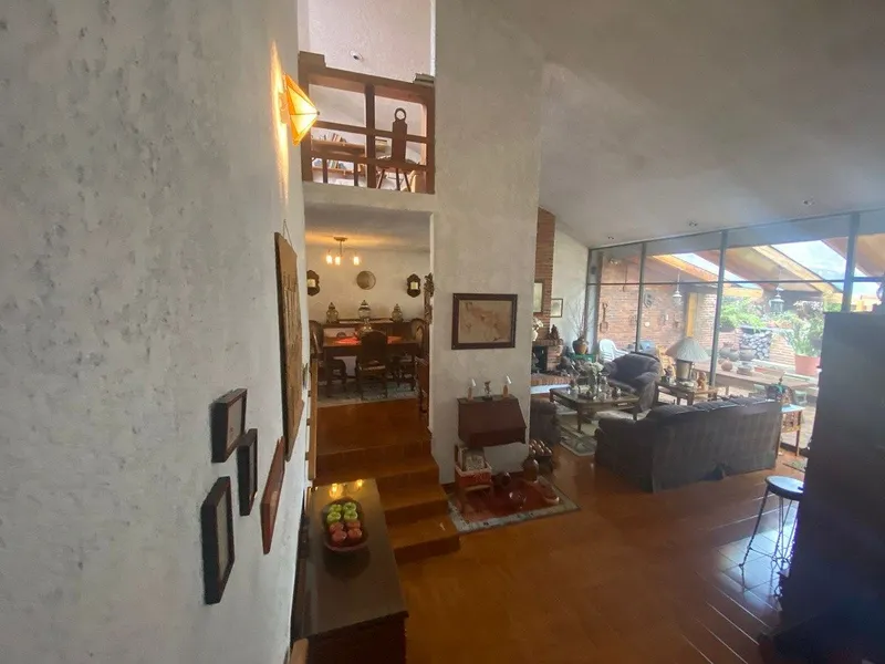 ¡Excelente casa de un solo nivel! Es ideal para quien busca remodelar a su gusto y con la comodidad de ser una sola planta con amplios espacios. Distribuida de la siguiente manera: - Vestíbulo - Área social con chimenea - Cantina - Cocina con barra - Comedor - Sala de descanso - Sala de tv o estudio - Jardín - Terraza techada - Cuarto de servicio con baño - Patio de tendido - Baño completo para visitas y recámaras secundarias - Recámara principal con baño completo, clóset y salida al jardín - Recámara secundaria con clóset, cuenta con tapanco y tiene salida al jardín - Segunda recámara secundaria con clóset y tapanco - 3 lugares de estacionamiento La casa cuenta con doble altura, cisterna, excelente estado de conservación. El fraccionamiento cuenta con 15 casas y con servicio de portero.