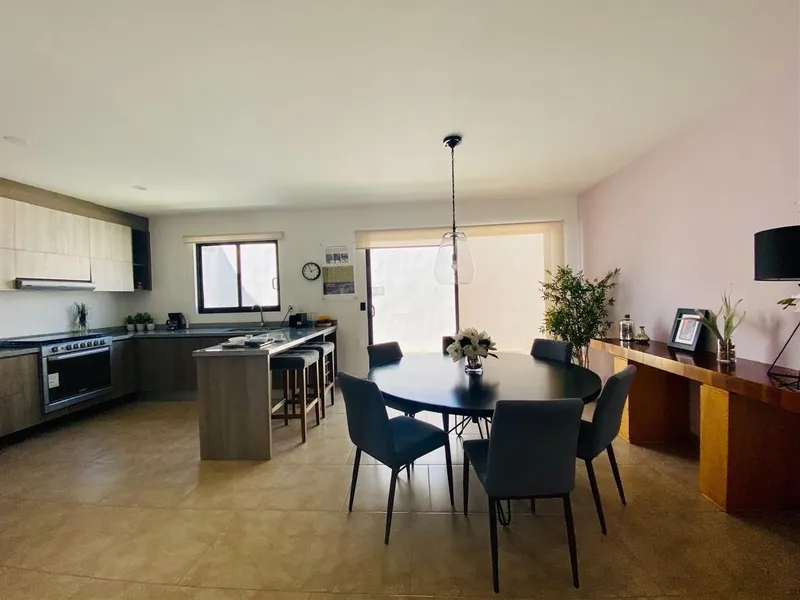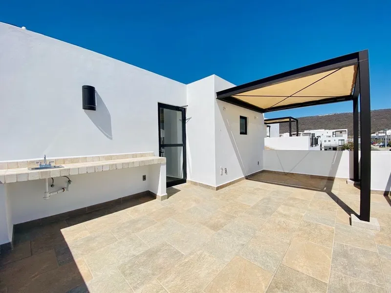 Casa nueva en venta dentro de privada con alberca, acceso controlado y vigilancia las 24 horas. La casa cuenta con 150 m2 de terreno y 211 m2 de construcción. Planta baja: - Sala-comedor - Cocina integral equipada con barra desayunadora - Jardín - Cuarto de lavado - Medio baño de visitas - Estacionamiento para 2 autos semitechado Planta alta: - Recámara principal con vestidor y baño - Recámaras secundarias que comparten baño Tercer Nivel: - Cuarta recámara con baño completo - Roof Garden con barra, tarja y pergolado