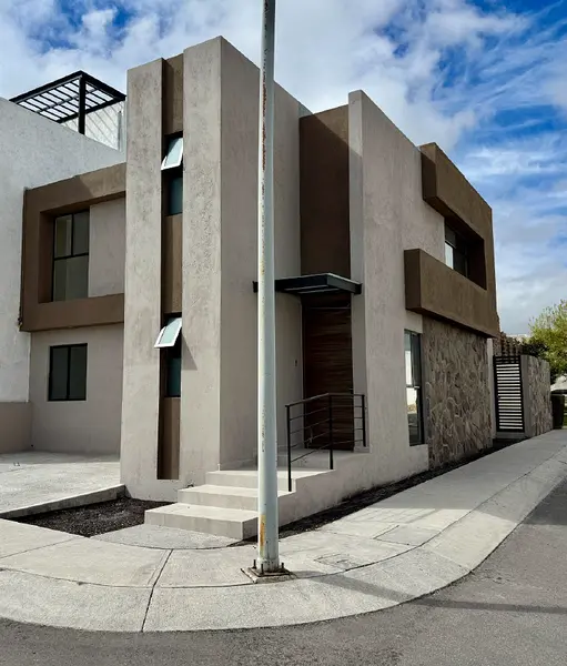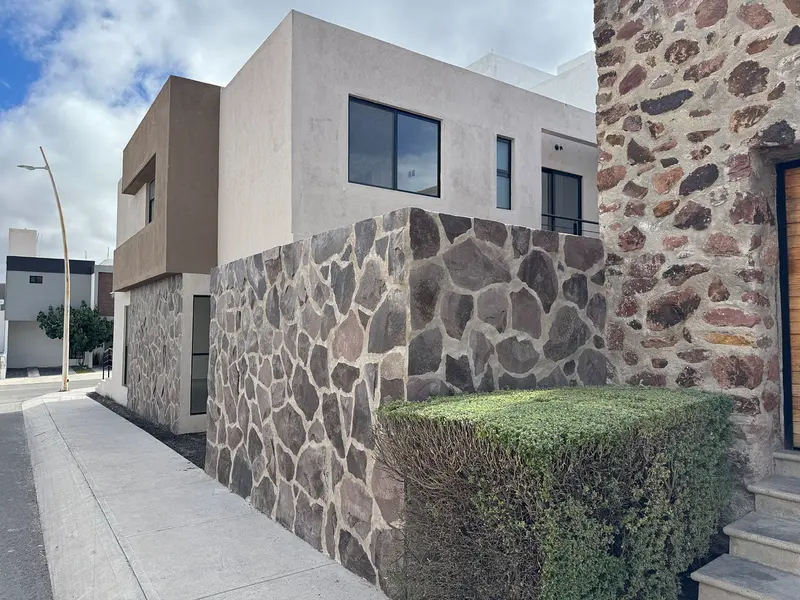 Residencia de autor con diseño contemporáneo y una cuidada selección de materiales, pensada para quienes valoran la arquitectura, el detalle y la calidad en cada espacio. Ubicada en Zákia, una de las zonas con mayor crecimiento y planeación urbana en Querétaro. Características y acabados destacados: Aplanados interiores de yeso y exteriores de mortero Pintura vinílica Berelinte en interiores y exteriores Impermeabilizante asfáltico prefabricado SBS aplicado por termofusión Pisos porcelánicos rectificados Interceramic en interiores y exteriores Regaderas con recubrimiento porcelánico rectificado Fachada lateral con piedra laja arqueológica natural Cancelería de aluminio negro con cristales de 6 mm y mosquiteros Cancelería de baño en vidrio templado de 10 mm Carpintería en melamina Kronospan color roble Cocina con cubiertas de granito, isla con cascada y equipo Mabe Puerta principal con estructura metálica y forrada en madera Banak Iluminación decorativa Tecnolite y accesorios eléctricos Bticino Cisternas, equipo hidroneumático y plomería con marcas premium como Helvex, Urrea y Pedrollo Esta casa de autor ofrece una experiencia residencial de alto nivel, combinando estética, funcionalidad y durabilidad, ideal para quienes buscan un hogar con carácter propio dentro de un entorno moderno y bien planeado.