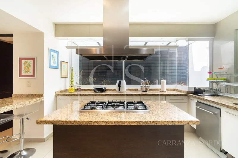 Una de las pocas residencias en Cumbres de Santa Fe que combina terreno grande en esquina, orientación sur y vista panorámica hacia áreas verdes. Ubicada dentro de uno de los fraccionamientos más exclusivos y seguros de la zona poniente de la Ciudad de México, esta propiedad destaca por su extraordinario terreno de 796 m² en esquina, lo que le brinda mayor privacidad, amplitud y una magnífica entrada de luz natural durante todo el día gracias a su privilegiada orientación sur. La arquitectura de la casa privilegia la relación entre interior y exterior. Las áreas sociales se abren hacia una amplia terraza de madera y jardín plano, creando un espacio ideal para convivencias, reuniones y vida familiar al aire libre, rodeado de un entorno verde y tranquilo. En el interior, la residencia ofrece generosos espacios de sala y comedor con grandes ventanales que enmarcan las vistas hacia el jardín. Además, cuenta con family room, cuarto de juegos y gimnasio, proporcionando distintos ambientes diseñados para disfrutar la vida familiar con comodidad. La casa cuenta con cuatro amplias recámaras, cada una con vestidor y baño, garantizando privacidad y confort para todos los miembros de la familia. La cocina es espaciosa y funcional, equipada con isla central, cubiertas de granito y excelente capacidad de almacenamiento, además de un agradable espacio para desayunador. La propiedad dispone de estacionamiento para seis autos y un área de servicio muy completa, con tres recámaras para personal de servicio, dos baños y espacios independientes para choferes. Una residencia que combina gran terreno, excelente orientación, privacidad, jardín amplio y vistas abiertas, dentro de uno de los desarrollos residenciales más exclusivos de Santa Fe.
