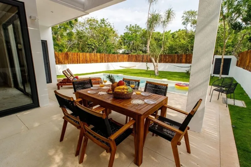 Lujosa villa ubicada en el prestigioso Tulum Country Club. Villas Caribe: Esta villa de 2 niveles le encantará desde el momento de su llegada. ¡Única! Dispone de 5 dormitorios, cada uno con su propio baño completo y un medio baño en el jardín con su regadera al aire libre. Se crearán momentos inolvidables en el espacio de vida de planta abierta entre el comedor, la cocina y la sala de estar. Este espacio cálidamente decorado invitará a los miembros de la familia y a los grupos de amigos a reunirse y compartir aperitivos, alrededor de la isla en la cocina o incluso al aire libre bajo la pérgola donde se puede hacer una deliciosa parrillada. Esta extraordinaria residencia también incluye una lavandería, un cuarto de almacenamiento y dos plazas de estacionamiento, lo que garantiza abundante espacio para todas sus necesidades. Los elegantes pisos y baños de mármol realzan aún más la sensación de opulencia y refinamiento en toda la casa. La casa se asienta sobre una terreno de más de 427 m2, con un patio privado soleado y una piscina de buen tamaño. Su peculiaridad es que se encuentra a menos de 1 km de la playa y del campo de golf PGA Riviera Maya.