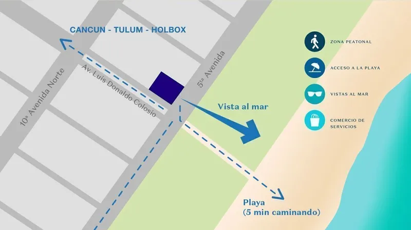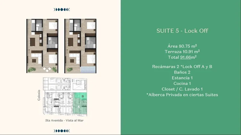Suite en venta en edificio nuevo en la 5a Avenida de Playa del Carmen, a cinco minutos caminando de la playa con vista lateral al mar desde su alberca privada. El edificio cuenta con estacionamiento (no exclusivo), locales comerciales en Planta Baja, lobby y roof club con gimnasio, asadores, alberca, co-working y terraza. Se entrega en julio de 2022.