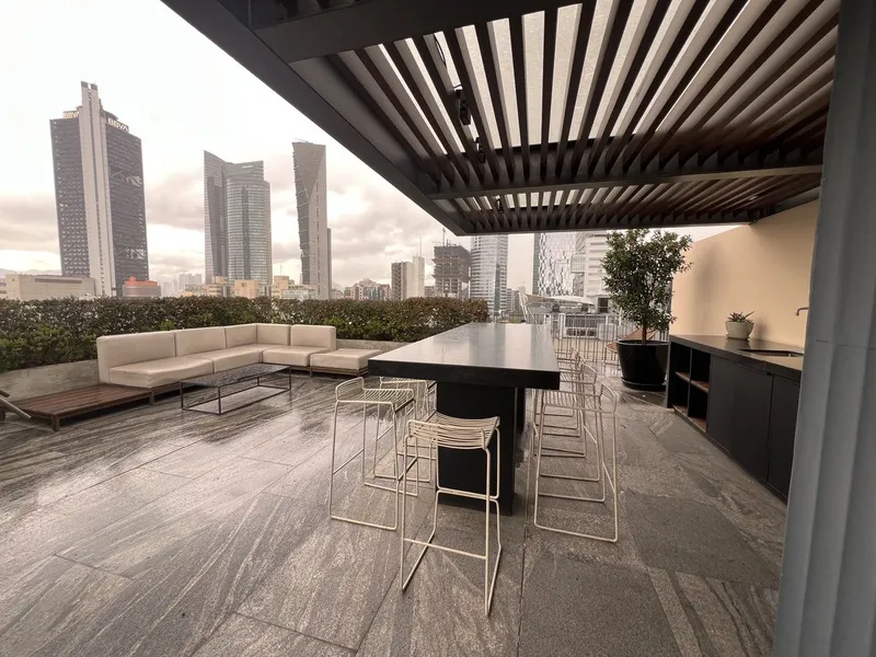 Hermoso departamento nuevo de 2 recámaras y 2 baños. Cocina abierta. Amueblado y Equipado Vistas hermosas 2 balcones Roof Garden, Gimnasio y Lavandería común Pastelería y cafetería en PB No aceptan mascotas
