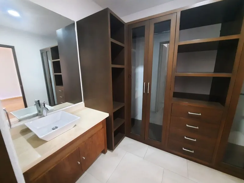 Departamento ubicado en segundo nivel, cuenta con acceso recibidor, con acabados en madera en pisos y closets, estancia con vista a jardín, cocina integral con espacio lavavajillas, barra, alacena, cuarto de lavado, cuarto de servicio con baño completo, baño de visitas, tres recámaras cada una con vestidor y baños completos con cancelería de cristal templado, dos de las recámaras con vista y acceso a terraza, 3 cajones de estacionamiento, elevador, vigilancia,, y estacionamiento de visitas.