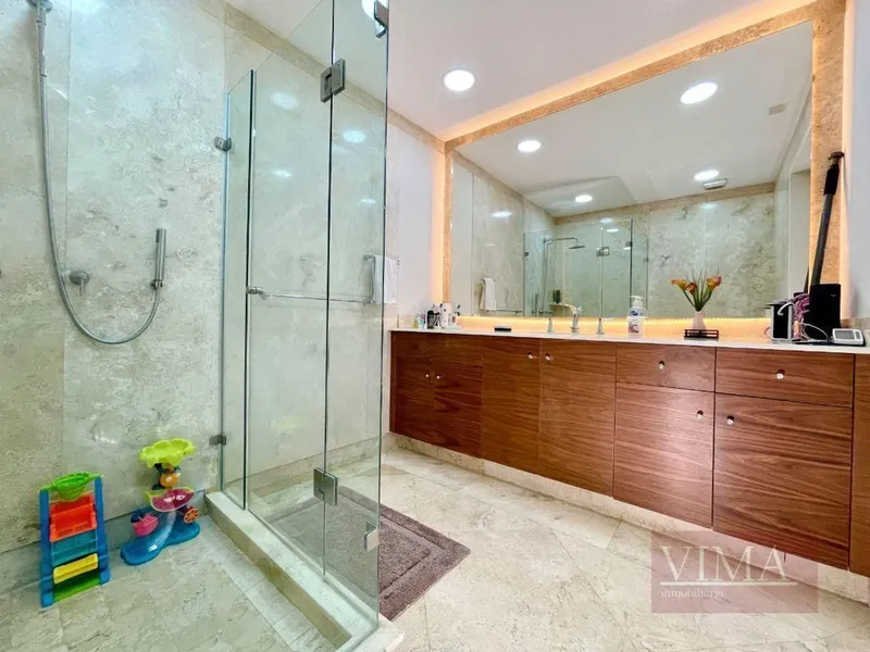 Amplio departamento de lujo con 362 m2. Tres recámaras con baño y vestidor, cocina renovada, persianas eléctricas, puerta blindada, tres lugares de estacionamiento, bodega y cuarto de servicio. Las áreas comunes incluyen: Alberca, gimnasio y salón de fiestas.