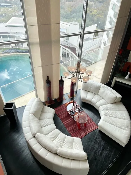Espectacular penthouse de dos pisos en venta en Punto Central. Cuenta con 463 m habitables en dos niveles. Planta baja con sala de doble altura y vista a la Sierra Madre, bar con salida a una terraza grande con vista al lago y jardín central, comedor con segunda terraza con vista hacia la Huasteca, baño de visitas, cuarto de juegos, cuarto de televisión, una recámara con baño completo, cocina con barra de granito, lavandería y cuarto de servicio con baño completo. Planta alta con acceso directamente desde el elevador, área social con vista al lago y jardín central, terraza con área de asoleadero y jacuzzi con vista a la Huasteca, baño completo, oficina y recámara principal con sala, terraza privada con vista a la Sierra Madre, baño con cabina de hidromasaje y amplio vestidor. Cuenta con tres cajones de estacionamiento y bodega. Amenities: gimnasio, alberca con carril de nado semi olímpico y tina de hidromasaje, salón de eventos con terraza amueblados, parque con juegos infantiles, acceso restringido y seguridad 24/7. El valor comercial de este penthouse es de $31 millones de pesos, se está rematando en precio de oportunidad en $24.5 millones.