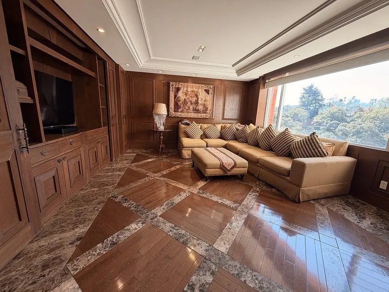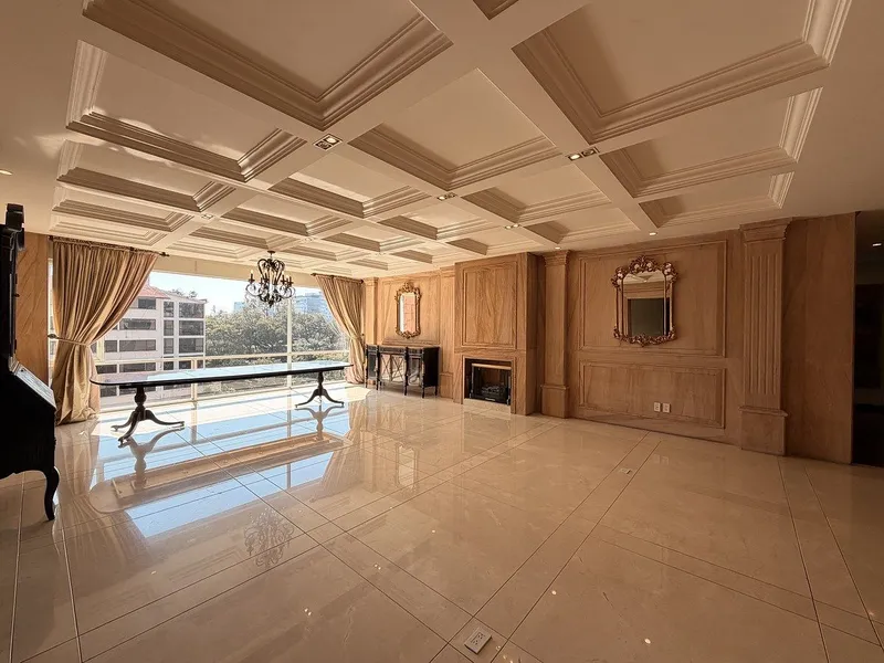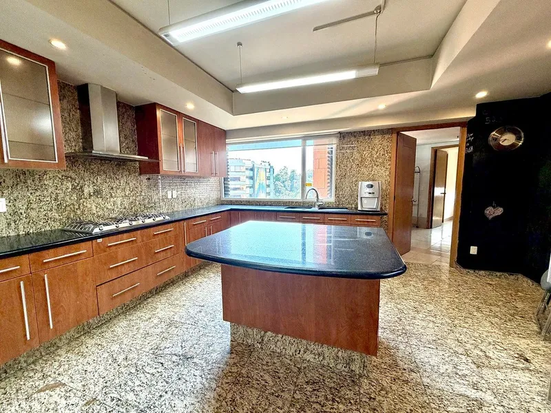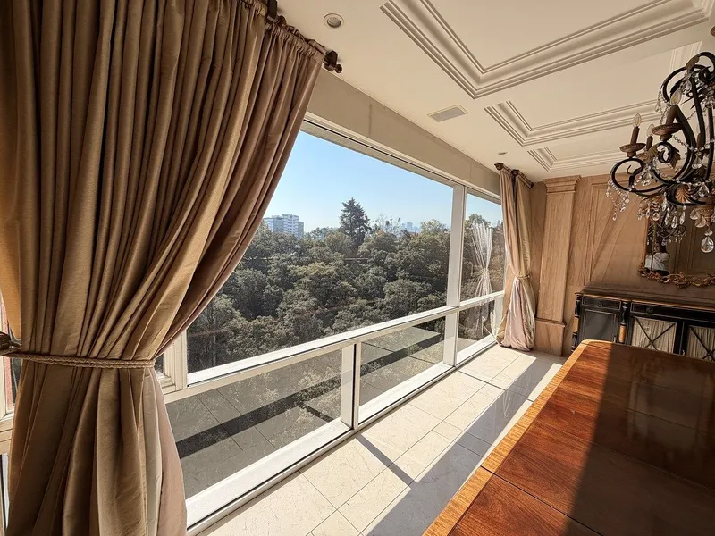 Departamento de Lujo en Venta en Bosques de Tabachines 327, Bosques de las Lomas. Precio: $26,000,000 MXN Superficie: 446.92 m² Piso: 10 Mantenimiento: $25,000 Año de construcción: 1999 Exclusivo y elegante departamento con excelente orientación, ubicado en uno de los residenciales más completos y consolidados de Bosques de las Lomas. Destaca por sus espacios amplios, techos altos y una extraordinaria entrada de luz natural en todas sus áreas. La propiedad cuenta con acabados de alta calidad, como pisos de madera y paredes cubiertas de mármol, además de aire acondicionado y calefacción, lo que garantiza confort durante todo el año. Distribución: 3 recámaras, todas con baño completo y vestidor Recámara principal con dos vestidores Amplia sala y comedor con cortinas eléctricas Bar ideal para reuniones sociales Family room / sala de TV con despensa privada Oficina / estudio Cocina integral con dos alacenas y área de desayunador Medio baño de visitas Cuarto de lavado Dos cuartos de servicio Bodega Entrada y elevador de servicio Cuarto para choferes Estacionamiento: 4 cajones de estacionamiento Amenidades del Residencial (Casa Club): Alberca techada Alberca al aire libre Gimnasio Ludoteca Salón de usos múltiples Salón de fiestas Cancha de tenis Cancha de squash Amplias áreas verdes Una propiedad ideal para familias o ejecutivos que buscan amplitud, privacidad, seguridad y amenidades de primer nivel, en una de las zonas más exclusivas de la Ciudad de México. 📞 Agenda tu cita y conócelo.