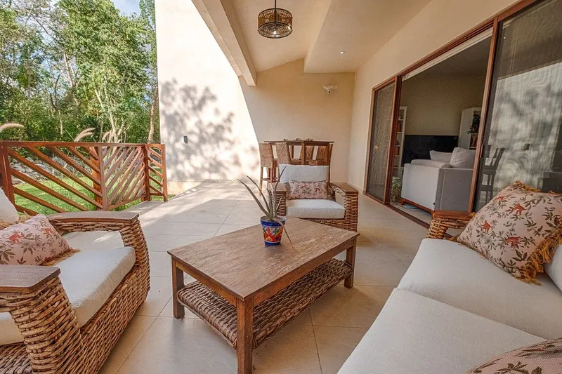 Departamento en planta baja con vista a la alberca en Puerto Aventuras Ubicado entre exuberante vegetación, con vistas a la alberca y a la selva, este departamento de 2 recámaras y 2 baños ofrece confort, interiores llenos de luz y agradables espacios interiores y exteriores, todo dentro de un residencial privado y seguro donde los restaurantes cierran temprano y las estrictas normas de ruido garantizan noches tranquilas. Situado en planta baja, ofrece un diseño bien pensado sin escaleras y acceso directo a la alberca, lo que facilita la vida diaria y la estancia de huéspedes. En el interior, el departamento es luminoso y fresco, con una fluida conexión entre la sala, el comedor, la terraza y la alberca común. Los acabados modernos y las texturas naturales crean un ambiente costero relajado, mientras que la decoración aporta calidez y carácter. Los dos baños completos cuentan con regaderas tipo walk-in, y una recámara con sistema lock-off brinda flexibilidad adicional para huéspedes o para uso en renta. Puerto Aventuras ofrece un estilo de vida único con uso de carritos de golf, acceso a la marina y la playa, escuelas internacionales y alternativas, cafés, restaurantes, mercados, tenis y golf. Este departamento es ideal como residencia principal, casa vacacional o inversión lista para rentarse. Vistas a la alberca y a la selva Terraza techada Regaderas modernas tipo walk-in Listo para habitar Acceso directo a la alberca común Asador integrado y fogatero Cajón de estacionamiento asignado Comunidad cerrada con acceso 24/7 Los precios están sujetos a cambios sin previo aviso debido a fluctuaciones diarias en el tipo de cambio y a la disponibilidad, especialmente en propiedades en preventa. Para conocer precios y disponibilidad actualizados, por favor contacte hoy mismo a uno de nuestros agentes. ID de la propiedad: *