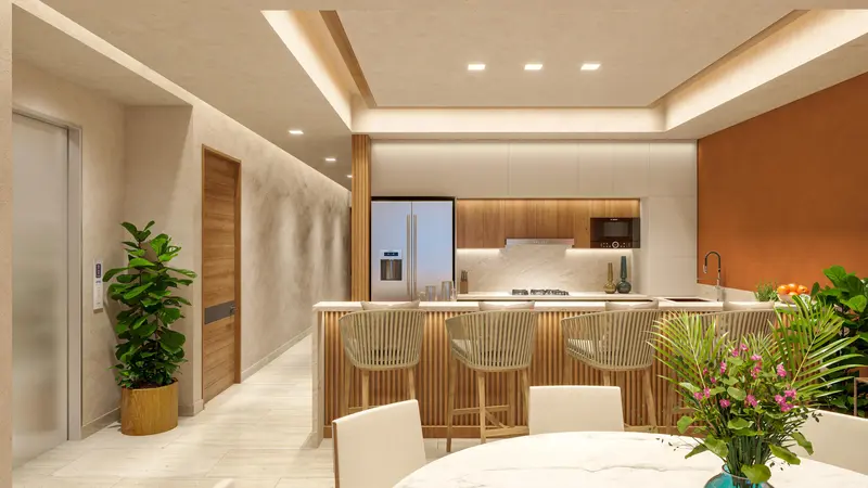 Piso* frente al mar Este departamento de 190m2 se encuentra en el cuarto nivel del edificio. Desde aquí podrás despertarte con una hermosa vista hacia el mar caribeño. Cuenta con 3 recámaras con baño completo propio y clóset. Dos de las recámaras tienen walk-in clóset. El cuarto de servicio cuenta con baño propio y entrada independiente. La recámara principal cuenta con un baño con lavabo doble y un balcón que te brindará vistas inigualables al mar. El departmaneto se distirbuye a lo largo del edificio, brindando una amplia estancia y amplias recámaras. Tendrás un cuarto exclusivo para lavandería y una amplia cocina con barra. La sala de estar es ideal para comedor y sillones de hasta 8 personas. Al final de la estancia podrás disfrutar de una amplia terraza, donde te deleitarás con los atardeceres rosados y nacarados del mar caribeño y las noches estrelladas lejos de los cielos urbanos. Ubicación Este departamento se encuentra en Punta Sam a 10 min. de Puerto Cancún y 30min. del Aeropuerto de Cancún. Es una nueva zona en desarrollo que se comparará en plusvalía con la Zona Hotelera de Cancún. Financiamiento Para tu comodidad, ofrecemos esquemas de pago que se puedan adecuar a tus necesidades: Puedes escoger entre dar un enganche del 10%, 30% ú 80%. Si el enganche es del 10%, el 30% del pago se realizará en 6 mensualidades y el restante 60% a contra entrega. Si el enganche es del 30%, el 60% del pago se realizará en 24 mensualidades y el restante 10% a contra entrega, aquí se da un descuento del 8%. Si el enganche es del 80%, el 20% restante se da a contra entrega, aquí se da un descuento del 15%. ¿Dudas? ¡No dudes en contactarnos! Aparta tu unidad ahora y vive el sueño de vivir frente al mar. La entrega del departamento será en Diciembre del 2026 y el club de playa estará disponible en verano 2025. *Precios y disponibilidad sujetos a cambio sin previo aviso *