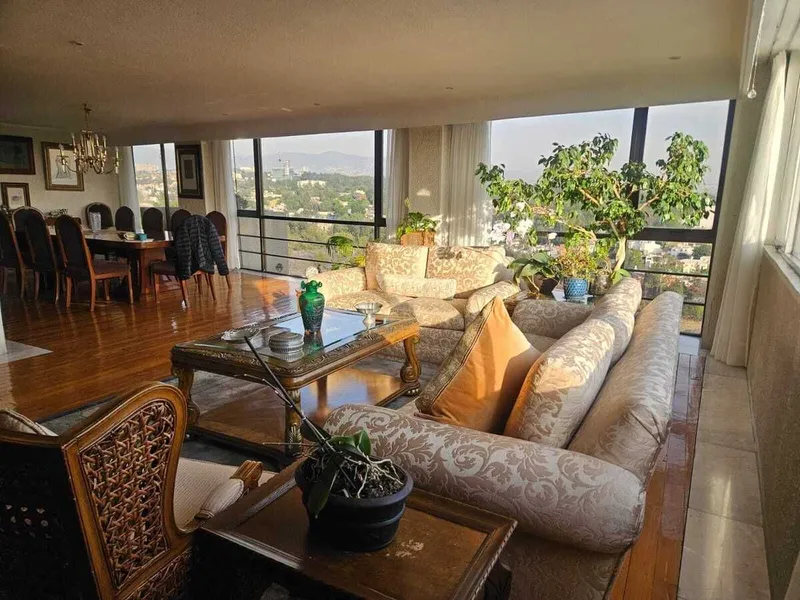 Se encuentra ubicado cerca de Av. de las Fuentes e Industria Militar a unos metros del Hipódromo de las Américas y Centro Citibanamex excelentes vías de acceso avenidas principales como avenida Industria Militar, paseo de las Palmas, periférico, cerca de bancos, Restaurantes. Departamento tipo Penthouse de 420 m2, de un solo nivel cuenta con 3 recamaras cada una con baño completo, vestidor, baño de visitas, sala, comedor, antecomedor, cocina integral, área y cuarto de servicio cuenta con tres lugares de estacionamiento. Cocina remodelada. Mantenimiento 6000 mensuales Predial 16000 anuales Vigilancia 24/7.