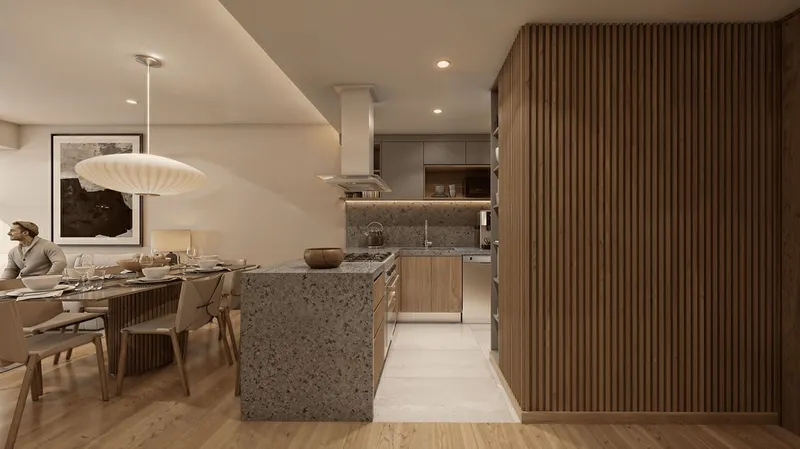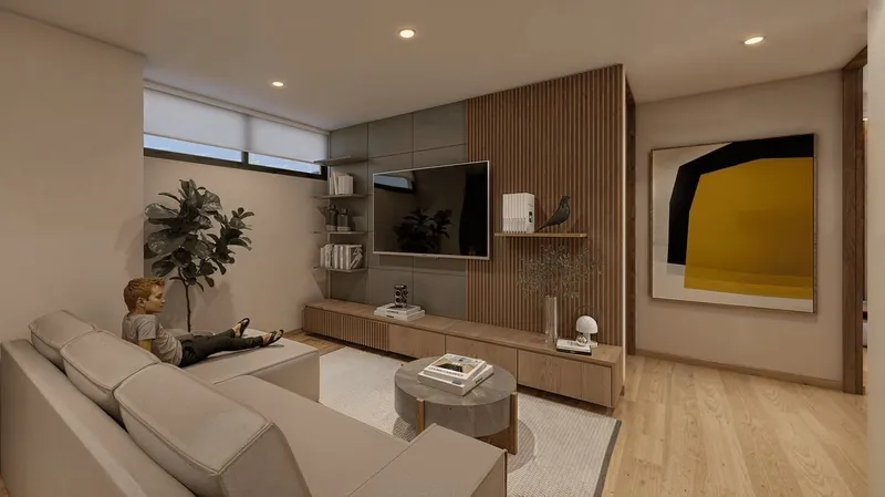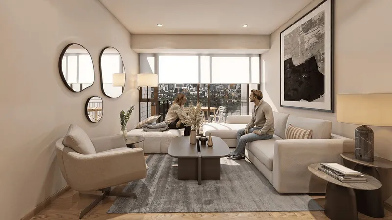 Nuevo condominio de 8 niveles de altura mas un nivel de roof garden de uso privado y oficinas en planta baja. Departamento interior en tercer nivel de 2 o 3 recámaras, family room*, sala-comedor, cocina, balcón. (84.38 m² habitables + 6 m² de balcón). Entrega en 2027