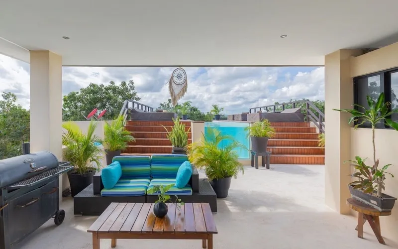 Increíble oportunidad para vivir y trabajar en el paraíso Si sueña con dirigir su propio negocio de hospitalidad en el paraíso, entonces esta oportunidad es para usted. El Cinco es un hotel boutique de 5 unidades con mucho encanto tropical. El complejo se encuentra a pocos minutos del centro bohemio y elegante de Tulum y de la nueva carretera de la playa que conduce directamente a la zona hotelera y a las hermosas playas de arena blanca. A los amantes de la naturaleza les encantará la cercanía a las ruinas de Tulum, Coba y docenas de cenotes asombrosos que están dispersos por la selva maya. Esta propiedad de hotel boutique de 3 pisos tiene todo lo necesario para que sus huéspedes se sientan cómodos y seguros. Hay cuatro suites de 1 habitación y un penthouse de 2 habitaciones. Todas las habitaciones de huéspedes decoradas con buen gusto tienen una cocina con barra de desayuno, una sala de estar llena de luz solar, un baño completo y algunas tienen un balcón o terraza privada fuera de la habitación. Están amuebladas de manera agradable y equipadas con ventiladores de techo y aire acondicionado. El hotel cuenta con un patio con jardines tropicales bellamente paisajísticos y una terraza en la azotea con alberca, un área para tomar el sol y un área de cocina al aire libre con parrilla. También tiene paneles solares para energía verde y acceso confiable a Internet de alta velocidad. Esta propiedad está completamente cerrada y cercada, ofreciendo una maravillosa sensación de seguridad y privacidad tanto para usted como para sus huéspedes. Se ofrece a la venta completamente llave en mano, para que pueda comenzar a generar ingresos por alquiler de inmediato. Tulum es un destino vacacional destacado con números de turismo en constante crecimiento, una industria de hospitalidad en auge y un mercado inmobiliario de rápido crecimiento. Este hotel boutique podría ser la inversión de sus sueños hecha realidad, y puede apostar que no permanecerá mucho tiempo en el mercado. Los propietarios de negocios astutos pueden obtener grandes ganancias al aprovechar este mercado en crecimiento. Póngase en contacto hoy mismo con uno de nuestros amigables y conocedores agentes para obtener más información sobre esta fantástica oportunidad de inversión.