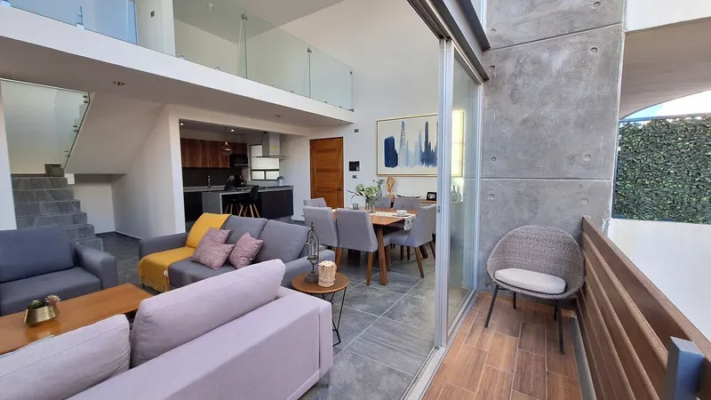 Espectacular penthouse de dos pisos en venta en Vertice Juriquilla. La estancia cuenta con doble altura. 135m2 habitables + 40m2 de roof privado PLANTA BAJA Sala - comedor con balcon Cocina abierta 2 recamaras 2 baños completos PLANTA ALTA Area de family Cuarto de lavado Roof privado con medio baño 2 estacionamientos Amenidades: alberca, area de mascotas, gimnasio, casa club Estricta vigilancia 24 horas, elevador Tienes que conocerlo. Agenda tu cita!!!