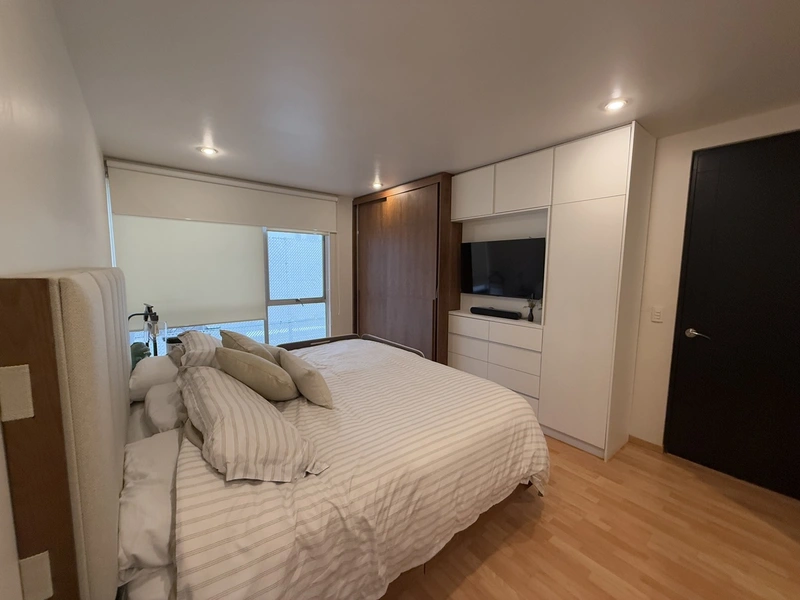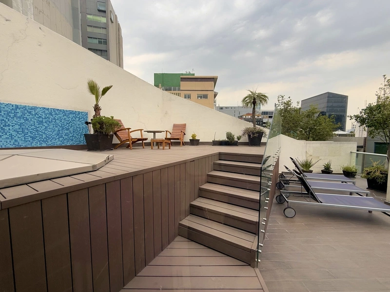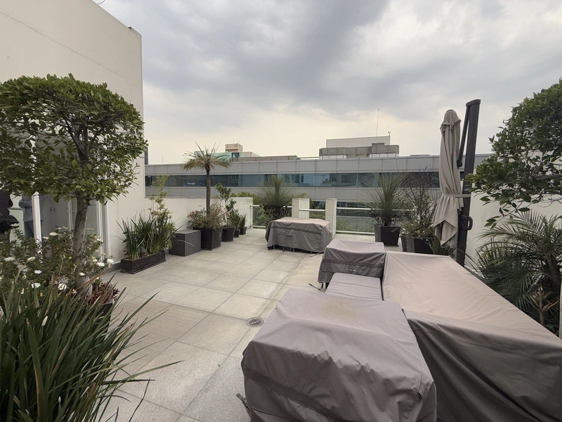 Exclusivo y muy espacioso departamento, ubicado en la mejor zona de polanco, entre Campos Elíseos y Rubén dario. Amplio y cómodo, departamento exterior con 27 departamentos distribuidos en 3 pisos (en último piso encontrarás el jacuzzi, salon de eventos, gimnasio) con 9 departamentos por piso diseñado en dos plantas. En planta baja: Sala comedor con balcón, medio baño ideal para tus visitas, cocina integral equipada, área de lavanderia, cuarto de servicio. Balcón y baño completo. El planta alta: Recámara principal, con vestidor y baño, ademas una recámara secundaria, baño, y amplio estudio o espacio para family room. Roof garden común: terraza, jacuzzi al aire libre, gimnasio profesional equipado, salón de eventos con cocineta y sanitarios. 2 cajones fijos de estacionamiento en S1, planta de luz, elevador, seguridad y vigilancia 24|7. Zona comercial, parques y centros comerciales cerca como Liverpool, bancos y el bosque y club a pie.