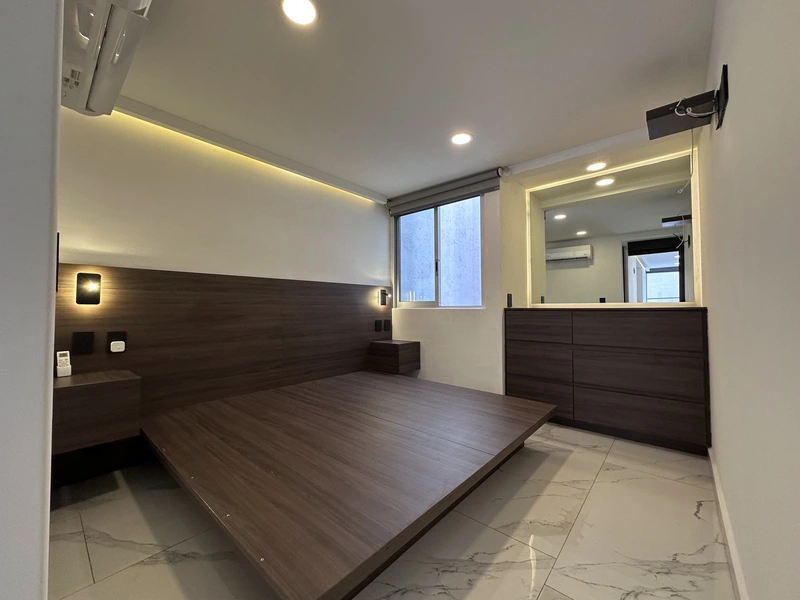 Departamento inteligente frente a parque Imagina despertar en un entorno tranquilo, moderno y perfectamente conectado con la ciudad. Este exclusivo edificio cuenta con 3 torres de sólo 3 niveles cada una, 2 departamentos por piso, cámaras de seguridad, gas natural e interphone. En un 2do piso se encuentra este departamento de 59 m², diseñado para quienes valoran el diseño inteligente y la tecnología al servicio del confort. • 1 recámara amplia con aire acondicionado • Gran vestidor que redefine el espacio personal • 1 baño completo, moderno y funcional • Cocina integral con estufa de inducción • Área de lavado ventilada y práctica • Persianas eléctricas y apagadores compatibles con Alexa: controla la luz y la atmósfera con tu voz • Cerradura digital para máxima seguridad • 1 cajón de estacionamiento independiente Este es el equilibrio perfecto entre tecnología, diseño y ubicación, frente a un parque que te invita a disfrutar cada día con calma y estilo. Un hogar pensado para una vida contemporánea, donde cada detalle suma valor y bienestar.