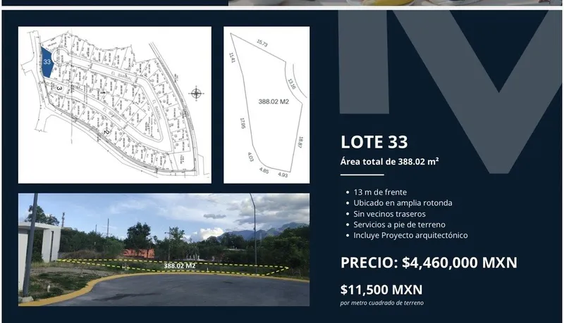 A sólo 900 metros de Carretera Nacional, se encuentra el Fraccionamiento El Barrial, con rápido acceso a escuelas y centros comerciales como Pueblo Serena y Esfera. El Barrial es uno de los primeros fraccionamientos en esta exclusiva área, es por esto que se consolida como una zona de alto potencial residencial. Ser de los primeros en invertir aquí es asegurar plusvalía. El Barrial es uno de los primeros fraccionamientos en esta exclusiva área, es por esto que se consolida como una zona de alto potencial residencial. Ser de los primeros en invertir aquí es asegurar plusvalía. El Barrial es uno de los primeros fraccionamientos en esta exclusiva área, es por esto que se consolida como una zona de alto potencial residencial. Ser de los primeros en invertir aquí es asegurar plusvalía. El Barrial es uno de los primeros fraccionamientos en esta exclusiva área, es por esto que se consolida como una zona de alto potencial residencial. Ser de los primeros en invertir aquí es asegurar plusvalía. Disfruta de la privacidad y seguridad que el fraccionamiento te ofrece. El fraccionamiento cuenta con únicamente 44 Lotes residenciales, los cuales más de la mitad ya se encuentran con construcción. Además cuenta con increíbles vistas a la Sierra Madre, Caseta de seguridad con control de acceso y tarjetas para residentes, y áreas verdes con amplias vialidades y banquetas urbanizadas LOTE 33 Área total de 388.02 m² 13 m de frente Ubicado en amplia rotonda Sin vecinos traseros Servicios a pie de terreno Incluye Proyecto arquitectónico PRECIO: $4,460,000 MXN $11,500 MXN