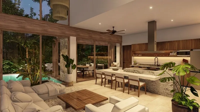 Nuevas villas de lujo con amenidades estilo resort Estas nuevas villas de 2 y 3 pisos ofrecen atractivos espacios interiores y exteriores, junto con los beneficios de vivir en una comunidad resort segura y cerrada. Ubicadas en un residencial de 290 hectáreas, el complejo está rodeado por un campo de golf de clase mundial y se encuentra a pocos minutos de la belleza natural de la costa caribeña. Tulum Country Club (anteriormente Bahía Príncipe) está en el corazón de la Riviera Maya, aproximadamente a mitad de camino entre Playa del Carmen y Tulum, y a solo 80 km al sur del Aeropuerto Internacional de Cancún. Estas hermosas villas de 3 habitaciones ofrecen diferentes diseños y opciones que se adaptan a sus necesidades, con cuatro prototipos distintos para elegir. Cuentan con un diseño abierto y espacioso con ventanas de piso a techo que permiten la entrada de abundante luz natural. Todas las residencias modernas tienen una cocina totalmente equipada con isla y una sala y comedor de doble altura, llenos de luz. Las villas cuentan con un patio cubierto con alberca, asador exterior y un área de jardín, además de un amplio rooftop con jacuzzi y vistas al campo de golf y a la selva. Todas las habitaciones están equipadas con closets y algunas tienen balcones privados y baños en suite. Estas viviendas cuentan con pisos de loseta y acabados de alta calidad, duraderos y fáciles de mantener. Se ofrecen a la venta sin amueblar, pero equipadas con ventiladores de techo y aire acondicionado. Los propietarios y huéspedes también pueden disfrutar de todos los beneficios de vivir en Tulum Country Club, incluyendo acceso al campo de golf de 27 hoyos diseñado por Robert Trent Jones II, servicio de transporte a Kay Beach, acceso preferencial al Jungle Fish Beach Club, además de precios especiales para pases de día. Estas nuevas villas son perfectas para rentas vacacionales o como su propio hogar en el paraíso. La entrega está programada para 12 meses a partir del depósito. Los precios de preventa están sujetos a disponibilidad y son sensibles al tiempo. Para obtener información actual sobre precios, contacte a uno de nuestros agentes hoy mismo.