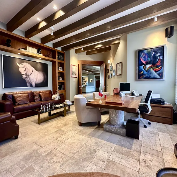 VEN A CONOCER ESTA HERMOSA RESIDENCIA DECORADA POR INTERIORISTA, EN UN HERMOSO CONDOMINIO DE 6 CASAS CONSTRUIDAS POR EL ARQ. ADOLFO GONZÁLEZ! La casa esta rodeada de áreas verdes parte del área común. Te recibe una espectacular fuente con una puerta de doble altura, misma que continúa en el amplio y cálido recibidor. La sala es muy amplia y cuenta con otra antesala y chimenea. El comedor para 14 personas con base de cantera y una fuente al centro para deleitar a tus invitados, también cuenta con chimenea. Tiene vista y salida al jardín por una puerta corrediza eléctrica. Family room y desayunador con salida a una acogedora terraza con sala, comedor, pérgola, fuente y un camastro doble para que disfrutes el hermoso jardín. Cocina con isla y un primer fregadero. Estación de cafe marca Miele, enfriador de vinos, 4 cajones refrigerantes, refrigerador con congelador doble, todo de la marca Subzero. Estufa Wolf, microondas, horno y cajón para calentar, lavavajillas, filtro de agua y mucho espacio para guardar. La cocina cuenta con una tarja doble con triturador de alimentos, 2 amplias alacenas, una ideal para vajillas. Área de lavado integrada a la cocina, patio de tendido, con una gran pecera. Despacho equipado con escritorio, sala, 2 libreros de piso a techo de madera de parota. Baño de visitas. Pisos de cantera, techos con vigas de nogal al igual que las puertas. En la planta alta: Todos los pisos de madera de ingeniería. 4 recámaras muy amplias con baño y grandes vestidores, 2 de las recámaras secundarias tienen terraza. La recámara principal cuenta con sala y escritorio y una terraza equipada con mesa exterior y sombrilla. El baño con una enorme regadera de la marca Axor con 3 velocidades de salida de agua, vapor con sistema digital, doble lavado, tocador, dos amplios vestidores. En sótano: Salón de juegos con barra, chimenea, sala y terraza, con una hermosa cava para vinos con vidrio de cristal templado. Baño de visitas. Cava espectacular, ideal para organizar con familia y amigos catas, equipado con pantry y fregadero. Estacionamiento techado para 12 autos con portón eléctrico. 3 bodegas. Fuente. Entrada al jardín. Gimnasio equipado con elíptica, caminadora y bicicleta fija. Cuarto para choferes y cuarto de servicio con baño completo cada uno. Sistema de iluminación Lutron y de sonido Sonos. Persianas incluidas. Paneles solares. La casa se vende con todo el mobiliario, arte y vinos.
