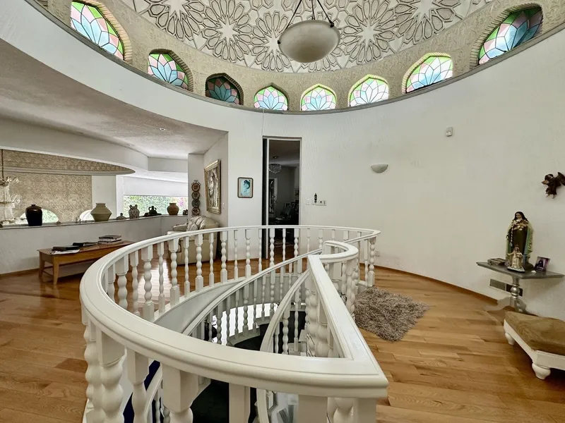 Ven a conocer esta hermosa casa rodeada de áreas verdes, máxima seguridad y tranquilidad. La propiedad esta en perfecto estado de conservación, con amplios espacios en un estilo árabe impecable, lleno de finos detalles. En Planta Baja: . Hermoso recibidor iluminado. . Despacho. . Amplia sala de TV. . Área de bar. . Cocina completa, iluminada con alacena. . Desayunador con hermosos vitrales. . Comedor principal muy amplio. . Sala principal de doble altura y una hermosa bóveda. . Otra sala con salida a terraza. . Baño de visitas. . Pisos de mármol. En Primer Nivel: . Al subir las escaleras otra hermosa bóveda con una iluminación natural increíble. . Sala de TV. . Closet de blancos. . Recámara principal con una sala, baño completo, terraza techada, con 2 amplios vestidores. . 3 recámaras con baño completo y vestidor o closet. . 2 amplias bodegas. . Cuarto de servicio con baño completo, área de lavado y tendido. . Cisterna 25,000 litros. . Cuarto de máquinas. . 8 estacionamientos. . Terraza techada con asador y tarja. . Muro llorón. Ven a conocer esta hermosa propiedad !