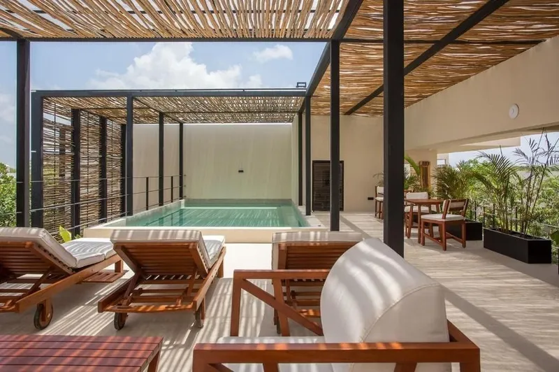 (ENGLISH BELOW) Ubicación: Calle 7 sur, La Veleta, Tulum Referencias: A 15 minutos de la zona arqueológica de Tulum y 10 minutos de la Playa. A 1:30 horas del aeropuerto de Cancún Construcción: 81.8 m2 // 880 SqFt Año de construcción: 2022 Número total de unidades: 20 Unit 303 HOA fee: Precio: MXN 4,253,600 Penthouse nuevo de 1 recámara y un baño; sala-comedor, cocina integral y terraza en condominio con las siguientes amenidades: - Alberca - Elevador - Hamacas - Áreas de descanso - Seguridad 24/7 ENGLISH Location: 7th South Street, La Veleta, Tulum References: 15 minutes from the archaeological zone of Tulum and 10 minutes from the beach. 1:30 hours from Cancun airport Construction: 81.8 m2 // 880 SqFt Year of construction: 2022 Total number of units: 20 Unit 303 HOA fees: Price: MXN 4,253,600 New 1 BR penthouse with a bathroom; living room, kitchen and terrace in condominium with the following amenities: - Swimming pool - Elevator - Hammocks - Rest areas - Security 24/7