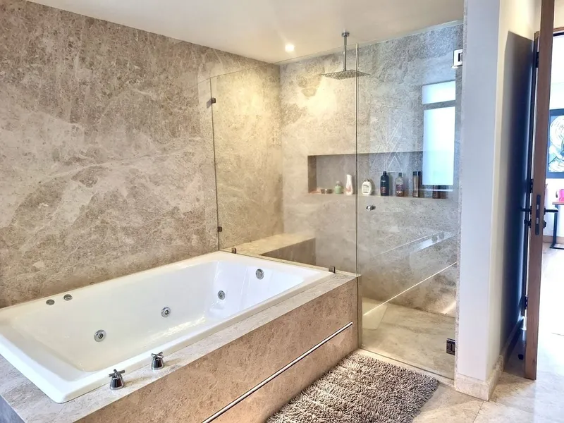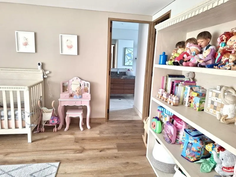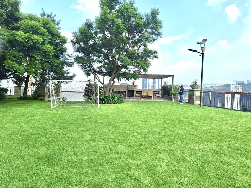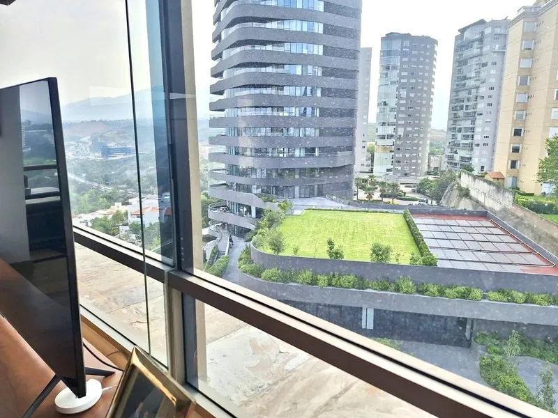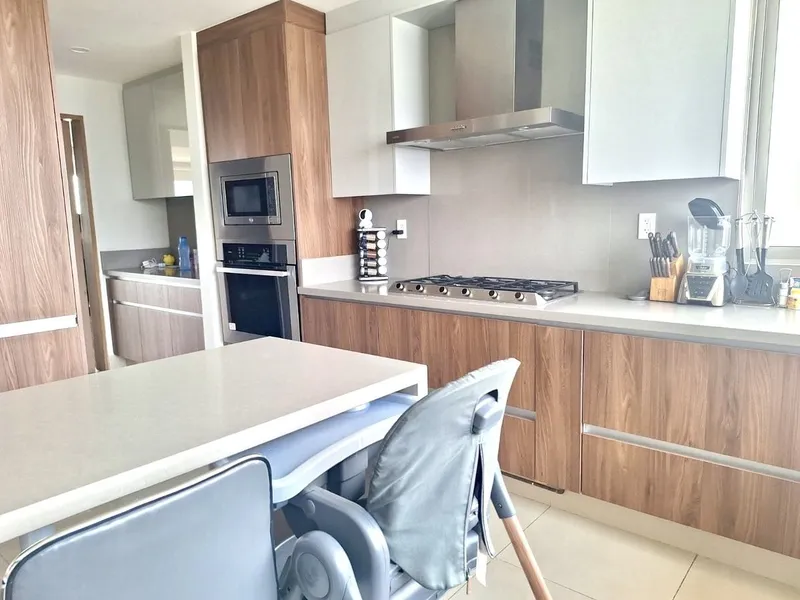 Hermoso departamento en la Cúspide Bosque Real con triple filtro de seguridad, amplios espacios, iluminado, techos altos, vistas verdes panorámicas al campo de golf, acabados de lujo en perfecto estado de conservación. Área social, pasillo de entrada, paredes con mamparas de madera, estancia con grandes ventanales y hermosa vista de gran tamaño que se une a una barra de bar espectacular, lindo baño de vistas con ventilación natural. Cocina iluminada con doble tarja, parrilla de estufa con campana, hornos independientes, cubiertas y barra de mármol, excelentes espacios para guardar y despensa. Área privativa, amplio family, closets de blancos, tres recámaras muy amplias, todas con vestidor y baño con ventilación natural, la recámara principal con baño con doble lavamanos, tina y regadera independientes y gran vestidor. Área de servicio, lavandería, cuarto de servicio de buen tamaño con closet y baño. Tres lugares de estacionamiento y bodega. Áreas comunes, jardines, hermosas terrazas para eventos con fogateros, equipadas con mesas y asadores, salón de eventos, gimnasio y cancha de pádel Estacionamiento para visitas. Vigilancia 24 horas.
