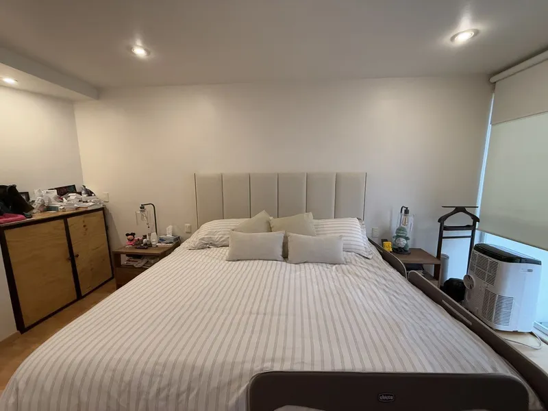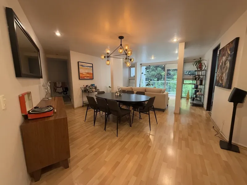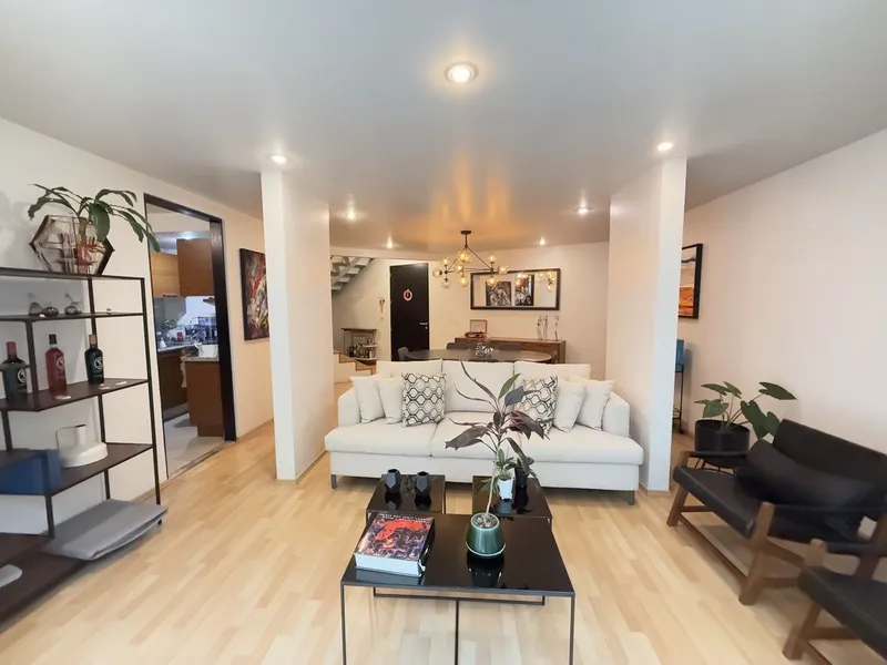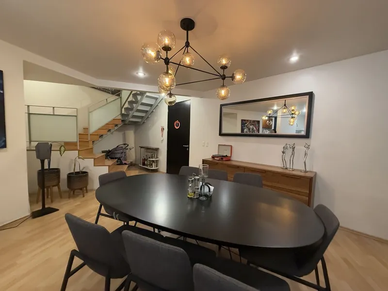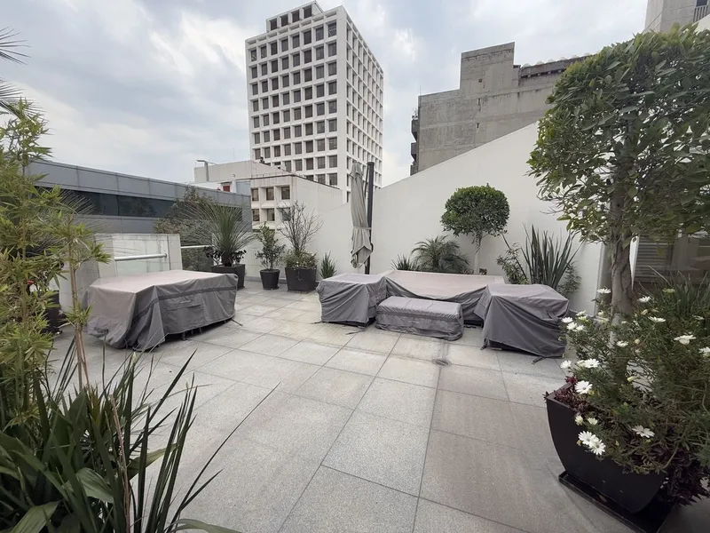 Exclusivo y muy espacioso departamento, ubicado en la mejor zona de polanco, entre Campos Elíseos y Rubén dario. Amplio y cómodo, departamento exterior con 27 departamentos distribuidos en 3 pisos (en último piso encontrarás el jacuzzi, salon de eventos, gimnasio) con 9 departamentos por piso diseñado en dos plantas. En planta baja: Sala comedor con balcón, medio baño ideal para tus visitas, cocina integral equipada, área de lavanderia, cuarto de servicio. Balcón y baño completo. El planta alta: Recámara principal, con vestidor y baño, ademas una recámara secundaria, baño, y amplio estudio o espacio para family room. Roof garden común: terraza, jacuzzi al aire libre, gimnasio profesional equipado, salón de eventos con cocineta y sanitarios. 2 cajones fijos de estacionamiento en S1, planta de luz, elevador, seguridad y vigilancia 24|7. Zona comercial, parques y centros comerciales cerca como Liverpool, bancos y el bosque y club a pie.