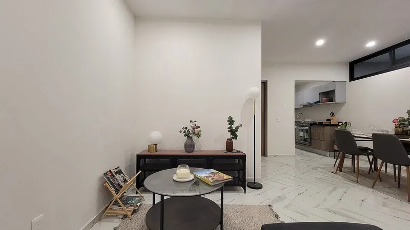 (ROJ) Exclusivo desarrollo de solo 9 departamentos con una propuesta de diseño arquitectónico minimalista. Cuenta con acabados de primera calidad, detalles en madera desde la fachada principal, un hermoso porcelanato blanco veteado en espacios comunes y en toda la zona de cocina, así como duela de madera de la mejor calidad para las recámaras. Se ubica en la colonia Portales Sur, considerada como una colonia tranquila y residencial, dentro de la cotizada colonia de Benito Juarez. La calle de Sevilla es amplia, a dos calles de la alberca olímpica y a dos calles del Metro Eje Central, magnifica conectividad para vehículos, muchas opciones de transporte público, comercios y escuelas cercanas, toda la zona es muy segura para caminar tanto en el día como en la noche. El desarrollo contará con vigilancia las 24. horas, con elevador para todos los niveles y 1 cajón de estacionamiento, así como una bodega privada por departamento. Departamento 302 *Cocina abierta *Sala-comedor *2 recámaras *2 baños completos *M2 habitables: 72.71 *M2 Roof garden privado: 66.84 1 estacionamiento y bodega. *Fotos departamento muestra