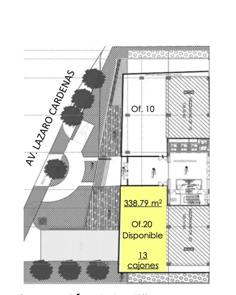 Área Útil disponible: 338.79 m2 Área Neta Rentable 371 m2 Entrega base: Con acabados Precio de Renta: $490/ m2 (ANR) + IVA Cajón Extra: $3,000 + IVA + Mtto. Mantenimiento: $22,604.78 mensual Precios más Iva Edificio de oficinas de 13 niveles. Con comerdor, Helipuerto, terrazas, salón de eventos. 30,000 m2 de construcción. Se encuentra sobre una de las principales avenidas, Av. Lázaro Cárdenas, siendo un punto estratégico para llegar a diferentes puntos del área metropolitana de Monterrey. Por mencionar algunas de las cercanías encontrarás hospitales, hoteles, elegantes restaurantes, grandes centros comerciales, escuelas y parques recreativos.